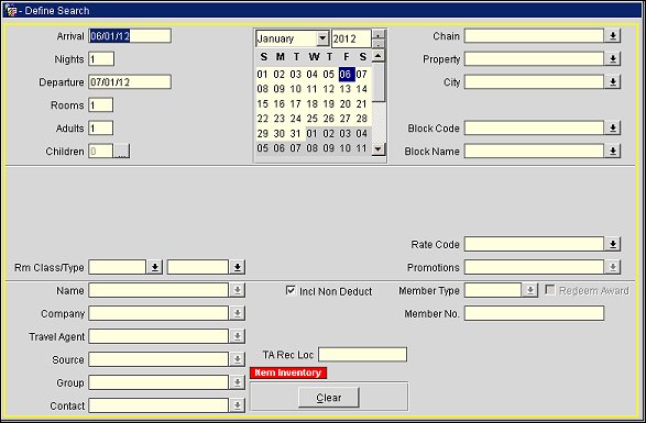When the OPR_<version number> OPERA Reservation Systems license is active and the General>ORS CM (hidden parameter) and CRO>General>Generic CRO application parameters are set to Y, the Define Search options vary for the ORS Sales Screen. All fields function the same as on the regular ORS Sales Screen, but the Profile options are inactive until either a Chain or Property has been specified. And once a Chain or Property has been specified, then only the Profiles that are attached to that particular Chain will be available for selection.