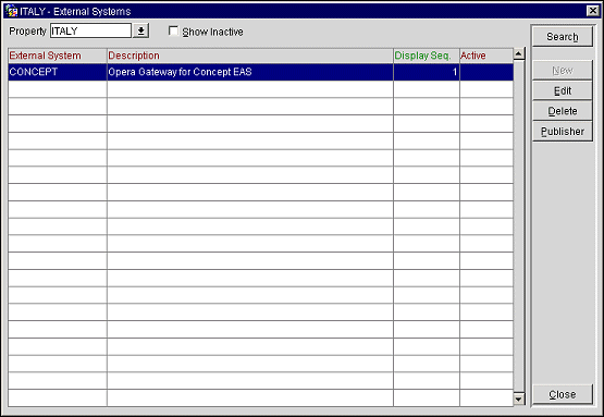 Publisher. This option is used if the external system is also receiving transactions from another system than OPERA. Example: You have a 2-way interface between OPERA and external system and a 1-way interface from a second external system to OPERA. All transactions that the 1-way is downloading to OPERA shall be uploaded to the 2-way as well. This can be achieved by configuring the 1- way external system as Publisher to the 2-way. The 2-way would act as ‘Subscriber’ in this case, as it subscribes to data that originally came from the 1-way. (See sample screen of Publisher setup.)