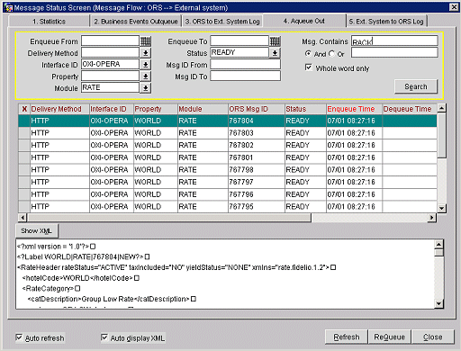 Example: OXI-OPERA interface Aqueue Out screen.