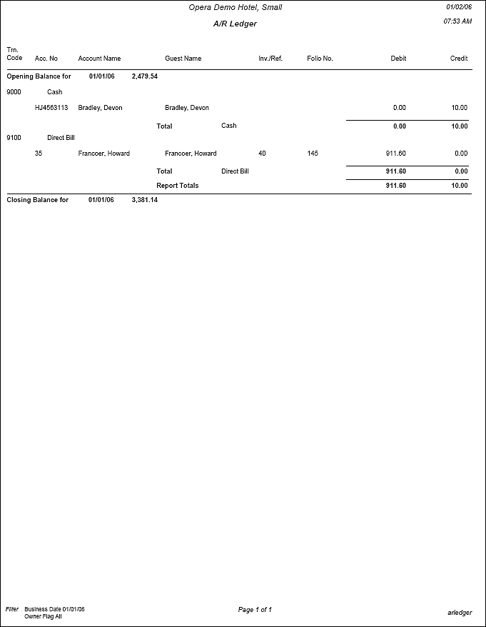 The AR Ledger Report displays all transactions that have been posted directly on an AR account or transferred to an Accounts Receivable account for a selected business date. Print this report to verify that all transactions balance back to the AR Ledger portion of the Trial Balance.