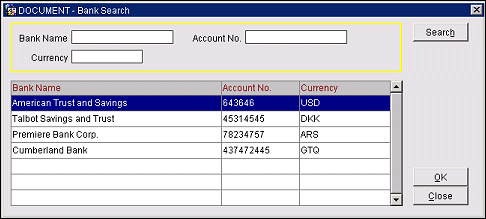To find a specific bank account, enter your search options and select the Search button. A list of accounts matching the search criteria appears in the search results grid. To select an account, highlight your choice and select the OK button.