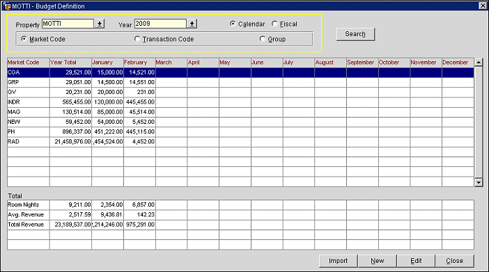 When the Cashiering>Budgets application function is set to Y, the Budget Definition screen is displayed by selecting Configuration>Cashiering>Budget Definition. Budget definition assists properties with setting budgets per defined period, which then reflect in the property’s reporting statistics. The Total budget displayed in the lower part of the screen can be viewed in the upper grid by amounts attached to Market Codes, Transaction Codes, or Group (revenues linked to a business block as sleeping rooms or events) depending on the option button selected.