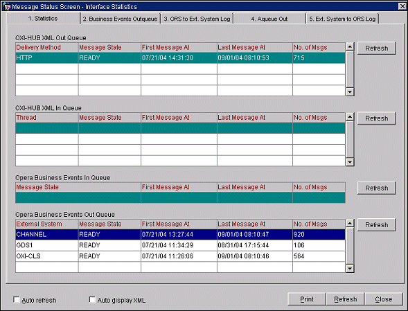 Note: This report is not part of the ORS/OCIS Standard Reports that are accessed through ORS/OCIS Miscellaneous>Reports. The Central System Manager Report is accessed through OXI_HUB. Select Interface Status>Statistics. The Message Status Screen – Interface Statistics screen appears.