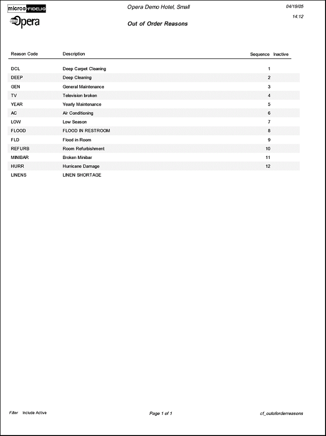 The Configuration report Out of Order Reasons will display all Out of Order Reasons that have been configured in the application. If the license code for multi property functionality is activated (OPP MHOT), this report will represent all codes on the template form.