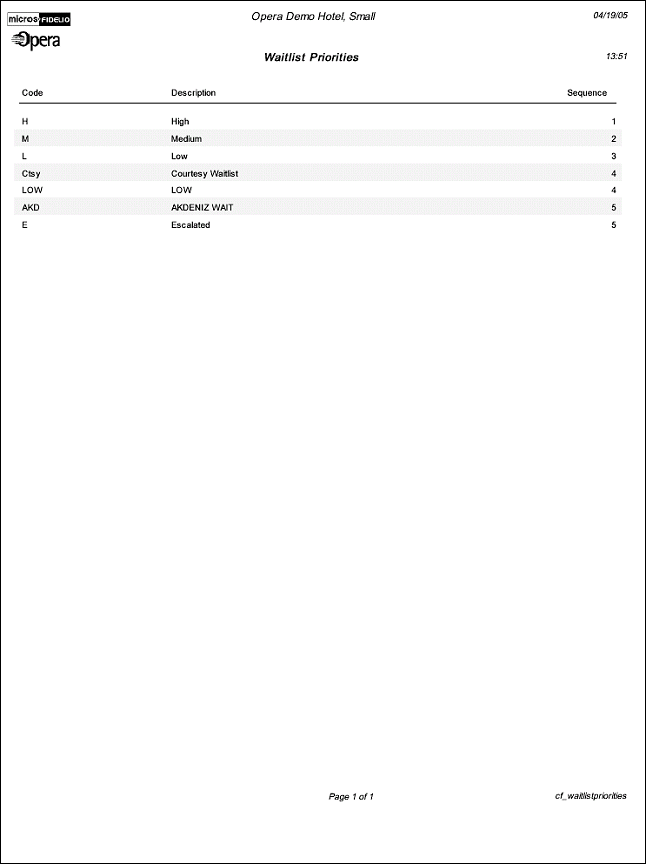 The Configuration report for Waitlist Priorities will display all Waitlist Priorities and their defined sequence order to display. The configuration item is only available if the Function WAITLIST is active. When placing a Reservation on Waitlist, the user must select a Waitlist Reason Code, Waitlist Priorities are not mandatory.