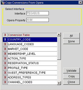 The purpose of this tool is to copy the conversion codes from OPERA to the selected interface. The copying is an efficient way to populate the interface conversion codes, instead of manually inputting the codes one by one. An example of an extensive list of conversion codes would be the Countries or Rate Codes. This form will only copy the conversion codes from OPERA based on the activated conversion codes for this interface. When copying, OPERA and external system values will be populated with the same value in the conversion details.