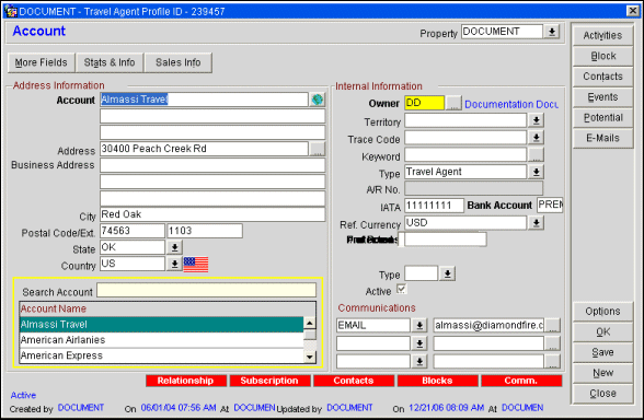 Use the Profile screen to enter demographic information about the account. To create a profile you need, at a minimum, the account name. Gather as much other information as possible or as directed by management. Note that you can enter multiple addresses, telephone numbers, and notes.
