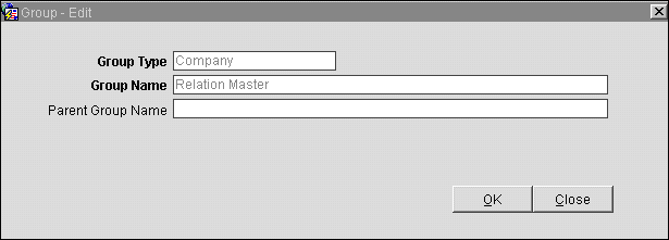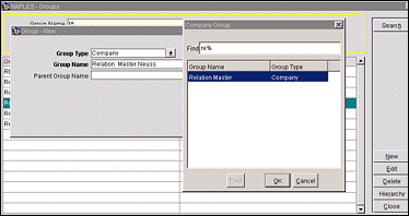 When creating a new group, select New from the Groups screen. In our example, select the Group Type (Company), the Group Name which you are adding to the tree (Relation Master Neuss) and the LOV for Parent Group (the name is the Group Name initially created, however, once applying the OK button the user will be able to actually select the Parent Group Name from the Tree.)
