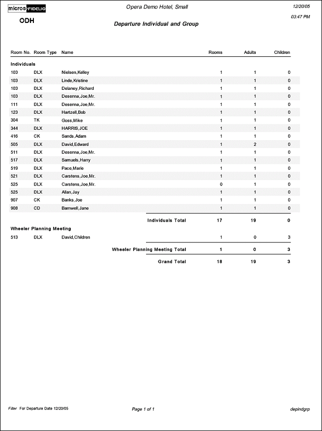 The Departures, Individual, and Groups Report displays all departures of individual guests and groups sorted by room number for a given date. Individual departures also list the number of adults and children associated with reservations having a departure date of this day. The Group departures section lists reservations by Group name, rather than the primary guest name on the reservation. Print this report to analyzed departure activity for your hotel on a specified day.