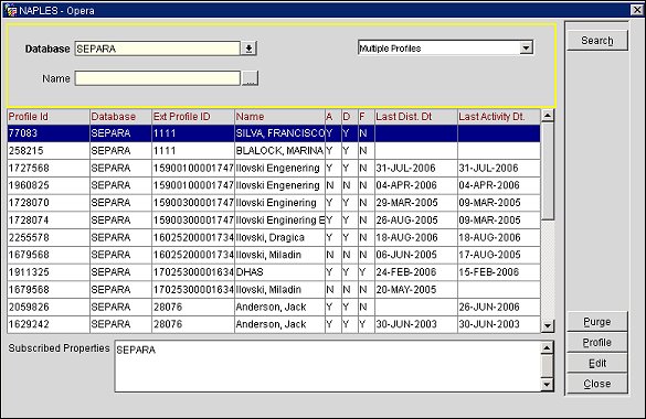 Name. If you have a specific profile name you want to search for, you may enter it in the Name field. Only profiles having that name will appear for either selection, Multiple Profiles or Multiple Subscriptions, from that database.