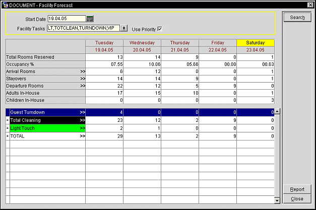 Facility Management Codes/Tasks. All requested facility management codes display for each forecasted day with the task’s required quantities as determined through the Facility Scheduler. The >> indicates that you can double-click on a date in that row to drill down to the Tasks By Room Type screen showing the number of each room type that needs to have the selected task completed for that date.