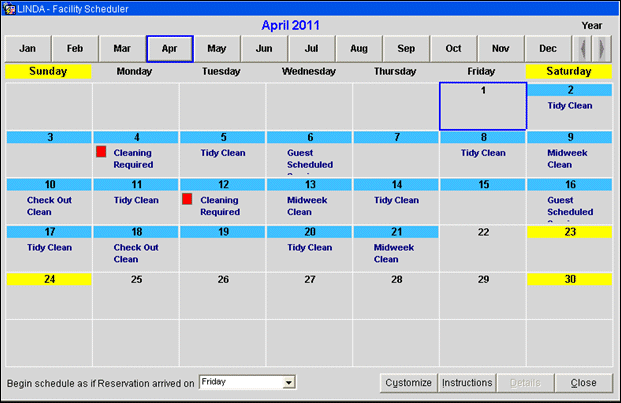 If you need to change the facility task default values for a checked-in reservation, you can select the Reservation Options > Facility Scheduler button that presents the default facility tasks and their frequency in a calendar display format and customize. For reservations that have not yet checked in, this can be accomplished when the ROOMS MANAGEMENT > CUSTOMIZE FACILITY SCHEDULE PRIOR TO CHECK IN application function is set to Y.