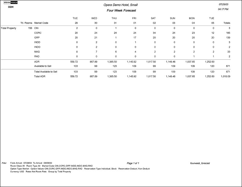 The Four Week Forecast Report displays the forecasted occupancy for each room type for Four Weeks at a time. The report prints per Room Type and then you have the ability to print a breakdown per Market Code, Market Group, Region, Source, Rate Category, Rate Code or Group. The Total available to Sell under each room type is determined by the number of rooms configured in the respective room type – OOO (Out of Order rooms).