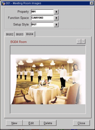 To add function space images that will be viewable from the Function Diary, select the Images button on the Function Space tab of the Rooms screen. The Meeting Room Images screen appears.
