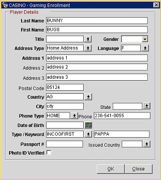 If a guest record is selected on the Profile Search screen, or if you are working from a guest's Profile Membership List screen, information for the current guest will automatically appear on the Gaming Enrollment screen. Provide the following information on the Gaming Enrollment screen. When you are done, select the OK button to submit the enrollment to the PTS system.