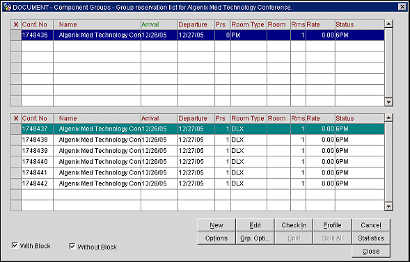 This feature might be used, for example, in conference and convention centers where a block of rooms is held for a particular convention (for instance, the Hotelier Association Block) and different company groups will take an allocation of rooms from the block and will be treated as separate “component entities.” If the number of rooms for one of the component group profile entities is reduced, they go back into the umbrella block and therefore would be readily available for pickup by one of the other component group entities. By default, associating rooms with a component group signifies that the rooms have been picked up, but might not at this time have specific reservations associated with them.