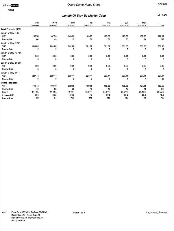 Based on the Group By selection, the report will print a breakdown by Market Group, Market Code, Room Class, Room Type, or display a 'Hotel' summary by Length of Stay (Blank Group by Selection).