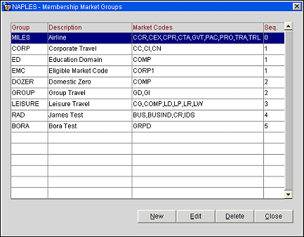 Select Configuration>Profile>Memberships>Market Groups. The membership market groups that have been configured display.