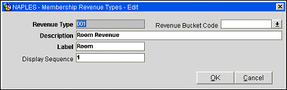 Display Sequence. A sequence number that determines the position of this code on the Membership revenue Types screen. If no sequence number is assigned, entries appear below entries that have a sequence number, in alphabetical order.
