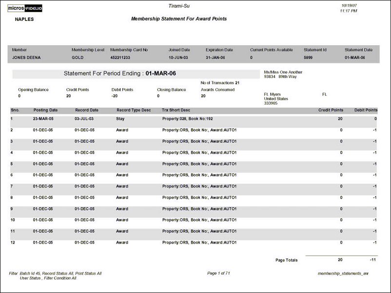 This report displays the membership statements for the selected batch. Users can view the award points available for the member at the time of the statement batch with the amount of credit points, debit points, closing balance, number of transactions, and awards consumed for the time period of the batch.