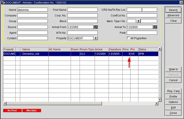 When you return to the Arrivals screen, the reservation is now shown with 1 room less in the Rms column.