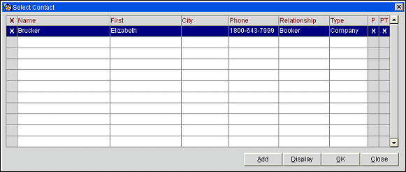 For Contacts, the screen displays the Last Name, First Name, City, Phone, and Relationship. When called from a business block, the screen will also display the contact Type and a column indicating the print contact. If the P (Primary) column is selected, that contact is the primary contact.