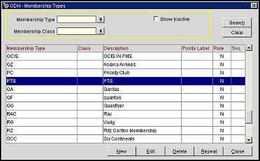 Membership types are used to identify the kinds of membership programs that are accepted by PMS and ORS/OCIS. The membership type information entered here includes the membership type code, membership program levels, or tiers (for example, gold, silver, bronze, elite, executive, and so on); the program rules (methods of points calculation, card validation algorithms, etc.); and the specific awards (special rates, upgrades, products, etc.) associated with each membership card type.