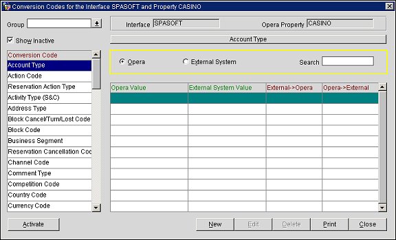The Conversion Codes for Interface XXX and Property YYY screen allows a user to activate the conversion tables that should be used for a specific interface. To access this screen, login to OXI, select the "SpaSoft" interface at the OPERA Login prompt, and then select Interface Configuration>Conversion Codes. The Conversion Codes for Interface XXX and Property XXX screen appears.