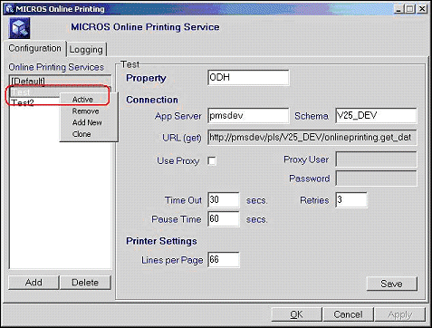 Open the control panel and select the MICROS Online Printing shortcut to start the configuration program.