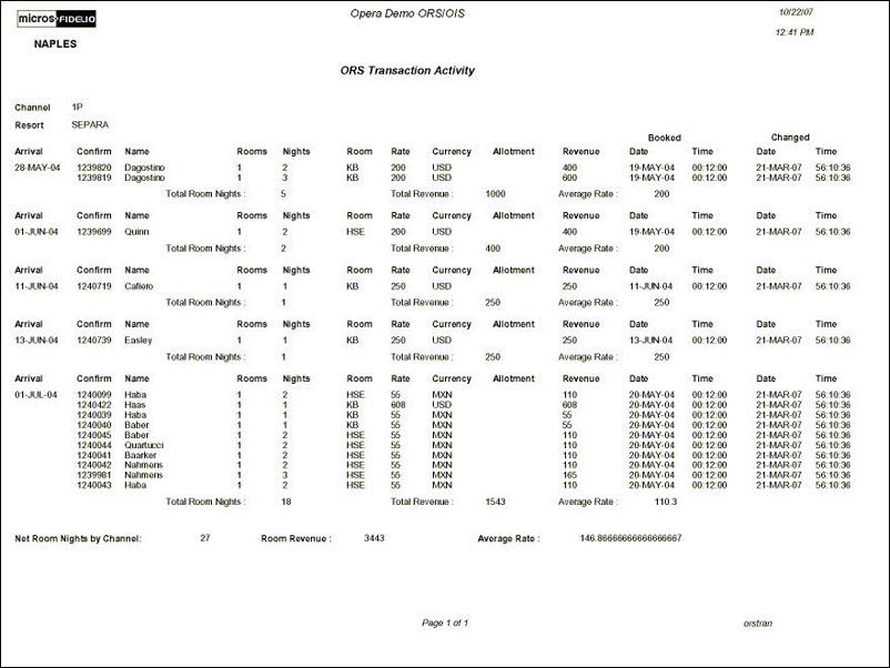 The ORS Transaction Activity Report displays information about reservations such as Arrival Date, Confirmation No, Nights, Room, Revenue... You can choose to filter by: Property and Data range and group by: Channel, Property and Arrival date.