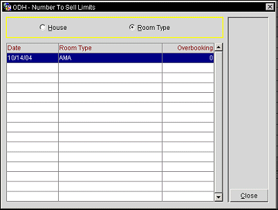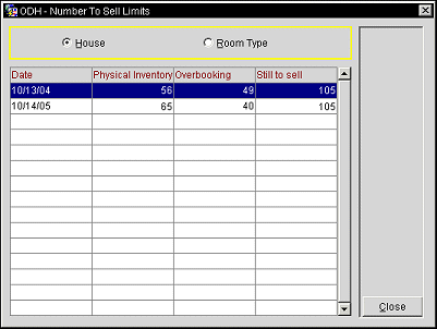 The Overbooking screen displays the number of actual and overbooking rooms for the house or for the room type for the dates selected during the Rate Query. The room type displayed reflects the type that is selected on the Rate Query Details screen, when the Overbooking button is selected.