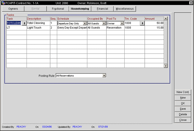 The Housekeeping Tab of the Owner's Contract screen displays the following information.
