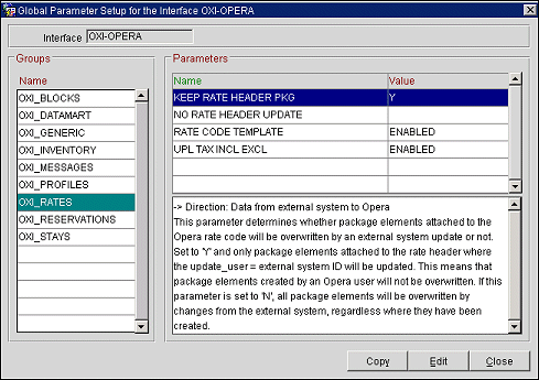 -> Direction: Data from external system to OPERA. This parameter determines whether package elements attached to the OPERA rate code will be overwritten by an external system update or not. Set to Y and only package elements attached to the rate header where the update_user = external system ID will be updated. This means that package elements created by an OPERA user will not be overwritten. If this parameter is set to N, all package elements will be overwritten by changes from the external system, regardless where they have been created. |