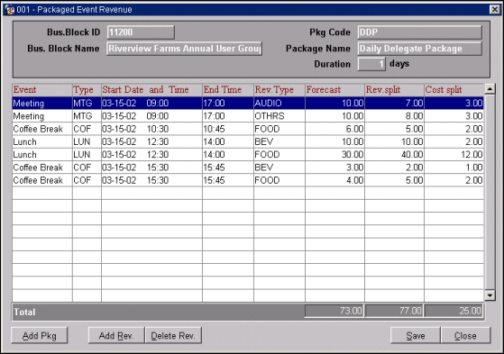 The Packaged Event Revenue screen appears when you select the Edit button from the Attached Catering Packages screen.
