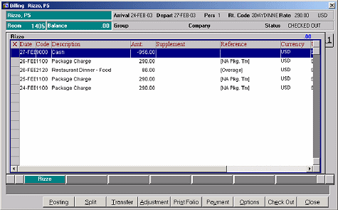 The guest account would appear from cashier billing as follows: