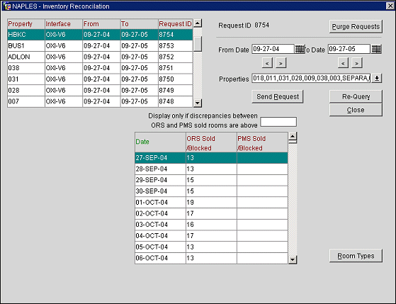 Reservations. Select this button to open the Inventory Reconciliation Reservations screen. This screen shows the detailed reservations for the sold rooms in ORS and PMS on the specified date. You can also have ORS send a reservation request to PMS.