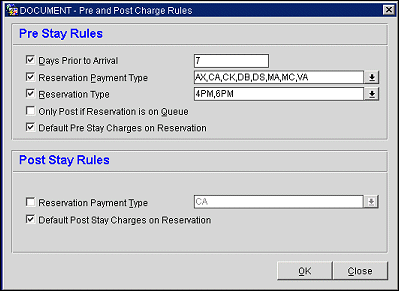 When the PRE STAY CHARGES and POST STAY CHARGES application settings are active, the availability of pre stay and post stay charging features for reservations/folios is also controlled by the pre stay and post stay rules set up for the property using the Pre and Post Charge Rules screen, and by the options selected on the reservation Privileges screen (see Privileges).