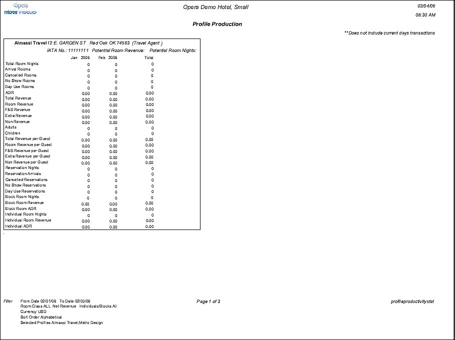 The report profileproductivitystat will be used to provide the Master account statistical information. This enables the property to print statistics based on an established hierarchy, and, therefore, quickly ascertain those Companies, Travel Agents or Sources that are providing the most business for the property.