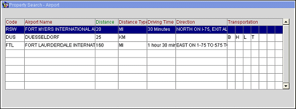 The Property Search - Airport screen appears when you select the Airports tab on the Sales Screen's Properties display. The Property Search - Airport screen provides a list of the airports serving the area of the property currently highlighted on the Properties screen.