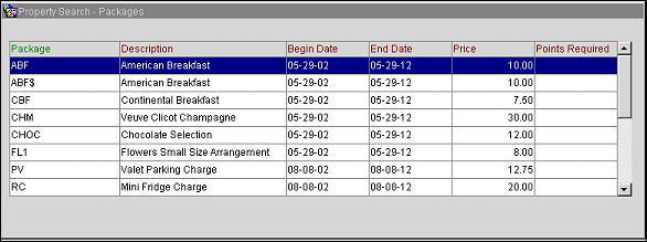 The Property Search - Packages screen appears when you select the Packages tab on the Sales Screen's Properties display. The Property Search - Packages screen provides a list of the packages that are available at the property that is currently highlighted on the Properties screen.