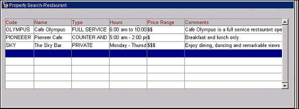 The Property Search - Restaurant screen appears when you select the Restaurant tab on the Sales Screen's Properties display. The Property Search - Restaurant screen provides a list of the restaurants that are available at the property that is currently highlighted on the Properties screen.