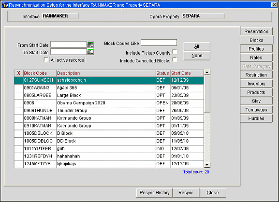 Total Count. Shows how many active blocks you have in the OPERA database. Once you have selected a date range the count is adjusted to match the number of blocks that fall into your selected date range.
