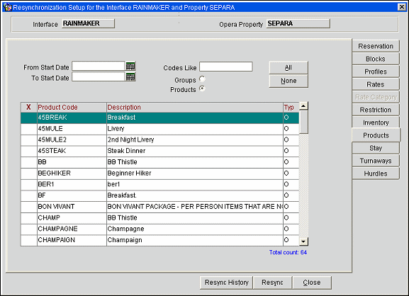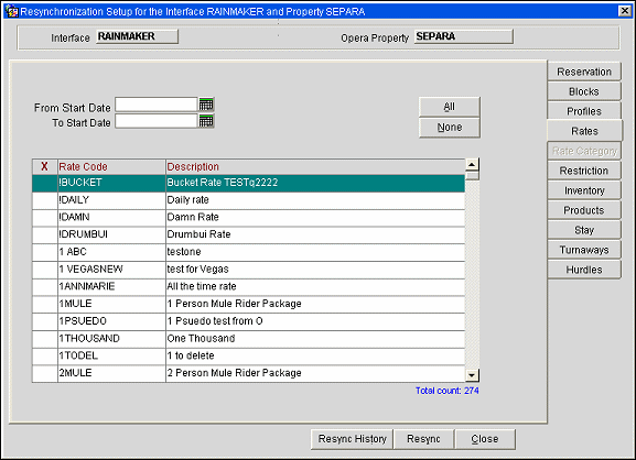 You have to select either a date range or check the rate codes in order to resync rates. A 'Total Count' of all active Rate Codes during the time frame entered will be displayed. User has the option to choose each rate code or all for resync to an external system.