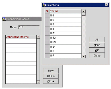 Connecting Rooms. When the Reservations > Connecting Rooms application parameter is set to Y, if two or more rooms can be connected to make a suite, select the down arrow to choose the numbers of the connected rooms. The Connecting Rooms screen appears. Select the New button from the Connecting Rooms screen to choose the rooms that connect to the current room.
