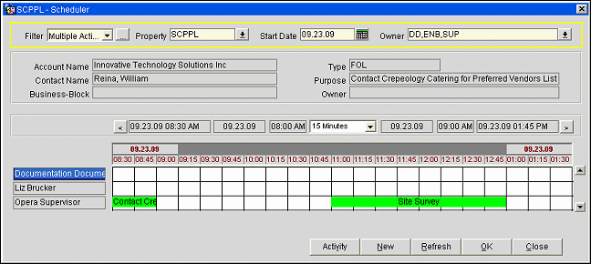 Owner. A multi-pick box where you can choose owners to search for their activities. If you are accessing the Scheduler from the main Activities menu, this will default to the person who logged on. If you are accessing the Scheduler from the Activities Search screen, the Owners that have been chosen in this screen will be passed to the Scheduler search criteria. When left empty, only those employees that have owner initial assigned to them will be shown.