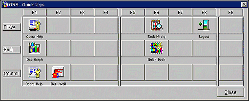 Select Miscellaneous>Show Quick Keys. OPERA's Quick Keys help you to quickly accomplish tasks you perform frequently, no matter where you are working in OPERA, without leaving the task you are currently working on. You can quickly accomplish tasks you frequently perform by using the OPERA Quick Keys template.