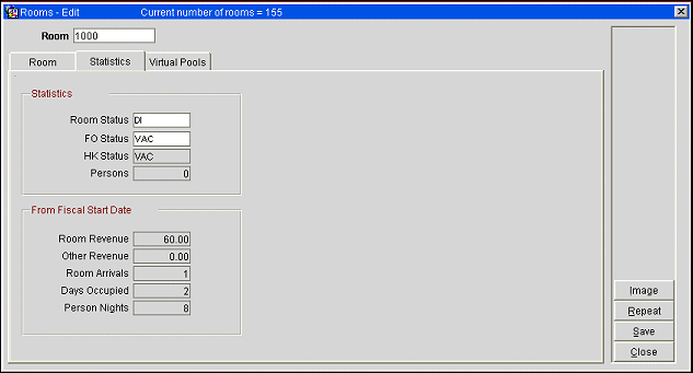 Select Configuration>Reservations>Room Classifications>Rooms to set up and manage room configurations for the property.  (You can also access this screen by selecting Configuration>Reservations>Function Space Classifications>Function Space when the OPS<version number> OPERA S&C license is active.)  On the Rooms - New or Rooms - Edit screen, the Statistics tab holds statistical information about the room you are currently configuring.