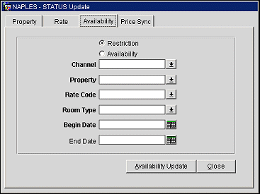 Select this tab to send new availability information (restrictions) to the GDS/ADS hosts. You can specify the begin and end date the rate code is available on the channel. This provides the same functionality if Restrictions Update is selected in the channel setup where your changes automatically transmit to the GDS/ADS hosts.