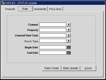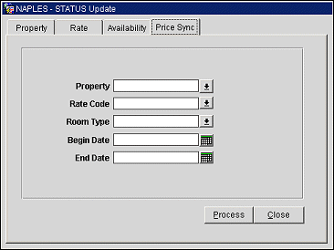 Use the Status Update feature to ensure your GDS/ADS hosts receive configuration changes made in your channels such as property update, rate update, and availability messages. You can also specify the begin and end dates for rate code availability. Additionally, you can use the Price Sync tab to synchronize rate prices in the internal table system for regional availability functionality.