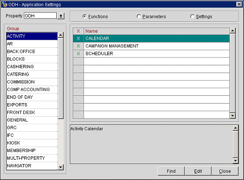 Prior to using the Revenue Pooling Functionality, several functions, parameters, and settings must be applied in OPERA. To apply the functions, parameters, and settings, select Setup>Application Settings. The Application Settings screen appears.